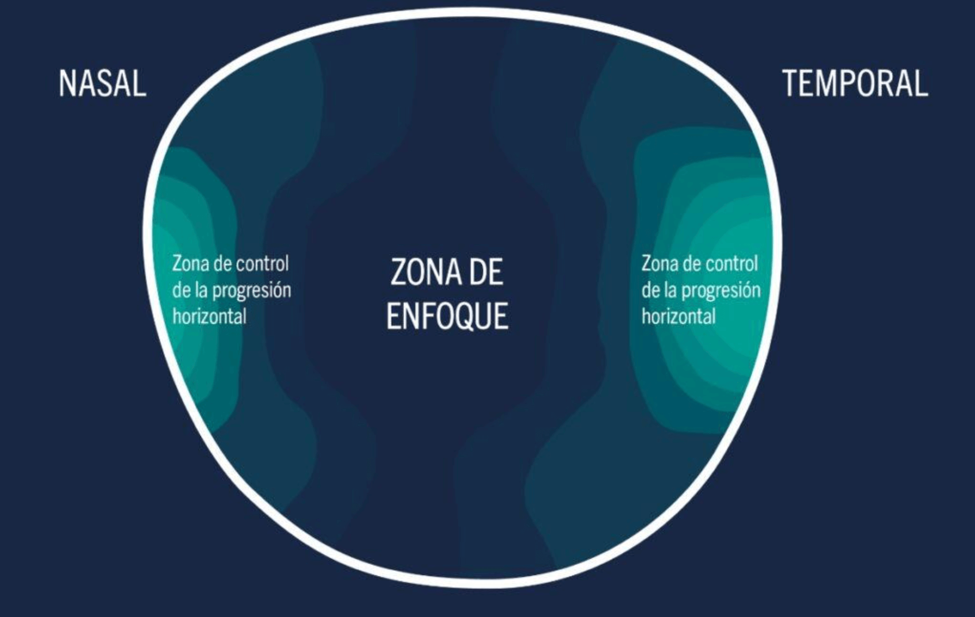 En los lentes MYCON, las zonas de control de la progresión están situadas en los laterales del lente. Esto garantiza que la nitidez de la visión en la parte inferior y superior del lente se altere lo menos posible.